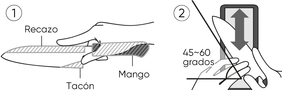 Estas piedras utilizan diamante ultraduro como material abrasivo y ofrecen una capacidad de desbaste extraordinaria. Incluso las hojas altamente endurecidas se afilan considerablemente más rápido que con piedras convencionales. No es necesario sumergirlas en agua antes de su uso, basta con humedecerlas antes y durante el proceso de afilado para comenzar de inmediato.